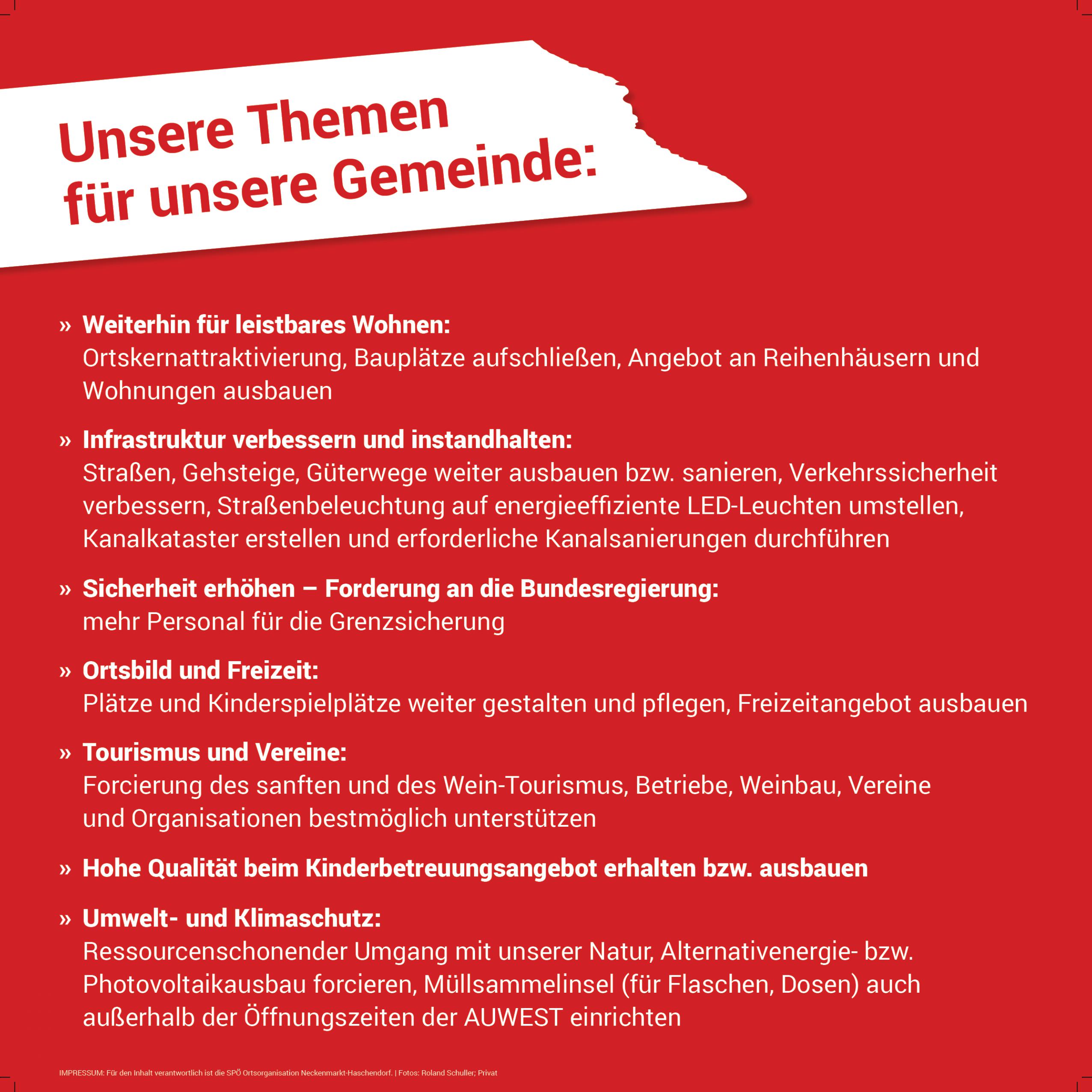 Neckenmarkt und Haschendorf stärken, entwickeln und weiter voranbringen. Wir wollen Bewährtes erhalten, aber auch neue Initiativen setzen, um unsere Heimatgemeinde weiter zu entwickeln und noch lebenswerter zu gestalten. Zahlreiche neue und überparteiliche Kandidatinnen verstärken das Team an bewährten Kräften für die kommende Gemeinderatsperiode 2022-2027.
