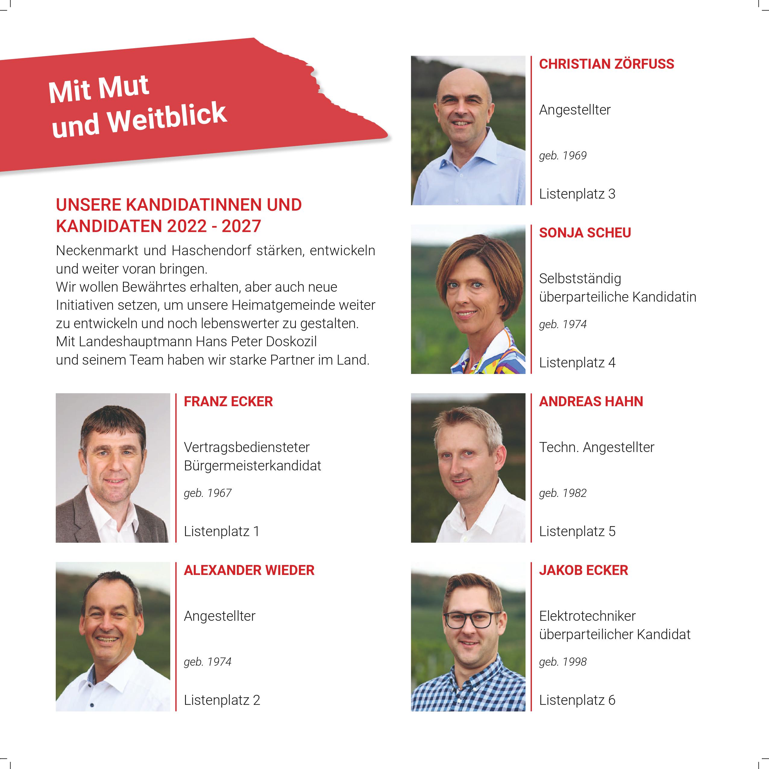 Neckenmarkt und Haschendorf stärken, entwickeln und weiter voranbringen. Wir wollen Bewährtes erhalten, aber auch neue Initiativen setzen, um unsere Heimatgemeinde weiter zu entwickeln und noch lebenswerter zu gestalten. Zahlreiche neue und überparteiliche Kandidatinnen verstärken das Team an bewährten Kräften für die kommende Gemeinderatsperiode 2022-2027.